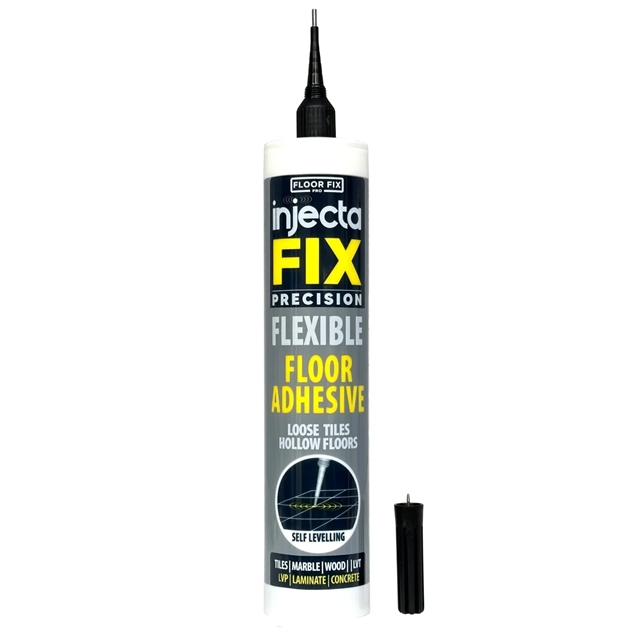 Hvordan fixet jeg min skrukke fliser? Svaret er enkelt. Du reparerer dine løse og skrukke fliser uden at bryde gulvet op med Injectafix. Injectafix Precision er en tyndtflydende injektionslim, som presses ind under flisen via fugerne og genskaber fast vedhæftning til underlaget. Du sparer tid, og undgår udskiftning af dine eksisterende fliser.