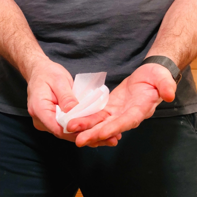 Fjern låget og folieforseglingen, før servietterne gennem krydset i låget og sæt det på igen. Riv servietterne af ved perforeringen, og brug dem straks, mens de er fugtige. Luk altid beholderen tæt efter brug for at forhindre udtørring. Opbevares køligt og tørt mellem +5 og 25 °C væk fra sol og antændelseskilder.